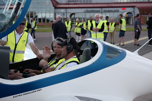 Jönköpings Landshövding Helena Jonsson provflyger Pure Flights elflygplan. Pilot Tom Ziedeck.